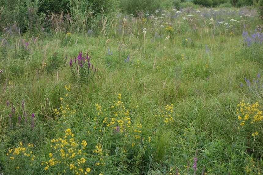 Zarůstající zaplavované nivní louky podél menších toků hostí dnes už vzácnou kombinaci vysokostébelných a vysokobylinných "praluk" s pestrobarevnou kombinací porostů purpurové kypreje vrbice (Lythrum salicaria), modrofialového rozrazilu dlouholistého (Veronica maritima) a žlutého pryskyřníku velkého (Ranunculus lingua). Foto A. a T. Kučerovi
