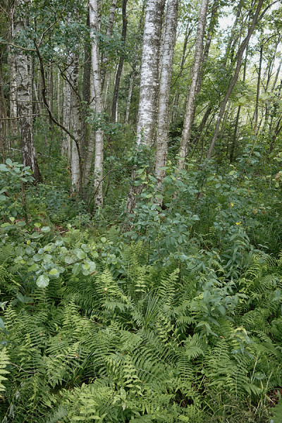 Bažinné březiny a olšiny s břízou pýřitou (Betula pubescens) a kapradiníkem bažinným (Thelypteris palustris) v podrostu. Foto A. a T. Kučerovi