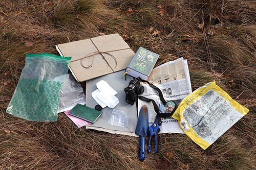 Vybavení na výzkum a sběr rostlin v terénu. Vedle různých sáčků, desek a papírů pro zakládání rostlin a zápisníků nechybějí lupa, fotoaparát, určovací klíč, zahradnické nůžky a lopatka. Foto J. Chrtek