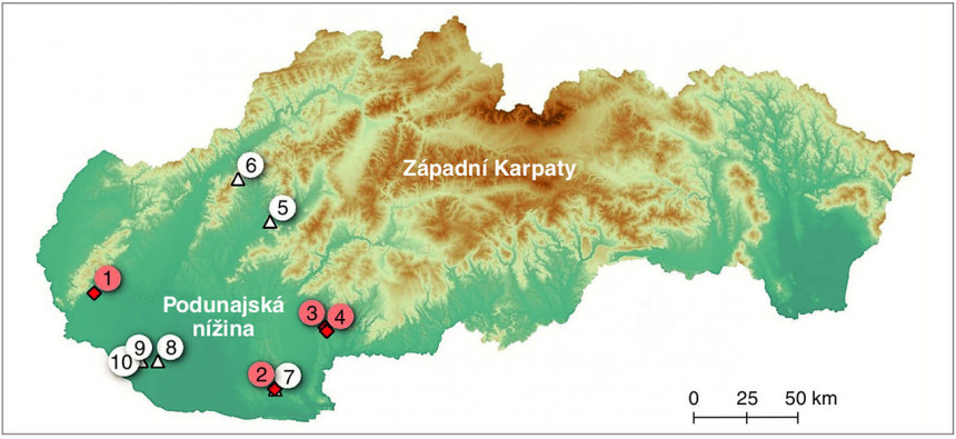 Geografické umístění paleoekologických profilů s makrozbytkovým záznamem v Podunajské nížině. Červeně označeny lokality, kde analýzu záznamu provedla autorka tohoto textu (A. Šolcová, rozená Potůčková), bíle lokality, kde záznam analyzovali jiní autoři. 1 – Šúr (Potůčková a kol. 2018, Petr a kol. 2013), 2 – Parížske močiare (Jamrichová a kol. 2014), 3 – Santovka-vesnice (Šolcová a kol. 2018), 4 – Santovka-PB (Šolco - vá a kol. 2020), 5 – Malé Bielice (Hájková a kol. 2013), 6 – Mitická slatina (Jamrichová a kol. 2017), 7 – Nová Vieska 2 (Procházka a kol. 2015), 8 – Mad (Procházka a kol. 2021), 9 – Štúrová (Pišút a kol. 2010), 10 – Vrakúň (Pišút a Procházka 2012). Orig. A. Šolcová