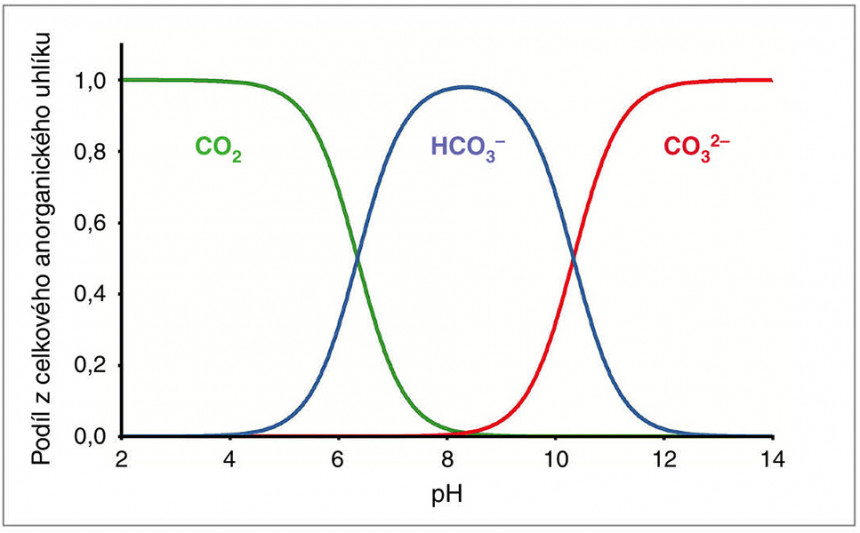 Relativní koncentrace jednotlivých forem rozpuštěného anorganického uhlíku (blíže v textu) v rámci uhličitanové rovnováhy v závislosti na pH vody při teplotě 25 °C. Celkový součet forem je vždy 100 %. Orig. A. Šolcová
