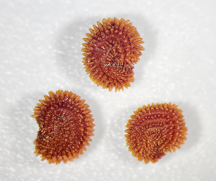 Semenáčky netýkavky malokvěté (Impatiens parviflora) v mraveništi mravenců rodu Formica. Bylo zjištěno, že v druhově chudších lokalitách mravenci sbírají a snášejí to, co je momentálně k dispozici (Holec a kol. 2023). Napomáhají tak i šíření u nás nepůvodní a invazní netýkavky malokvěté. Foto J. Moravec