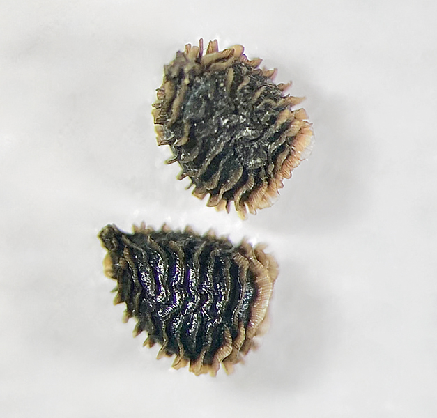 Penízek rolní (Thlaspi arvense) má semena 2 mm velká, plochá a oválného až vejcovitého tvaru. Na jedné straně je viditelný oddělený kořínek, což je činí asymetrickými. Povrch osemení je lesklý, se spirálovitým rýhováním. Foto J. Moravec