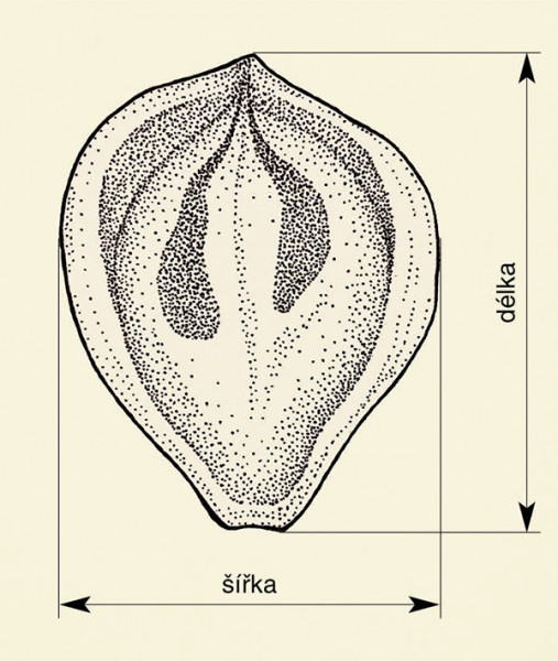 Měření délky a šířky u semen delších než širších.Orig. J. Moravec, upraveno