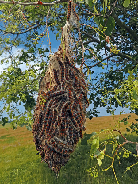 The author describes a finding of caterpillars of the relatively rare Small Eggar moth (Eriogaster lanestris) in the Kladno region. The caterpillars form silken nests from which they venture out in search of food. They attack several species of trees and shrubs, in this case the Small-Leaved Lime (Tilia cordata). Although the trees were completely defoliated, they were not threatened by the moth, as they produced new leaves again after several months.