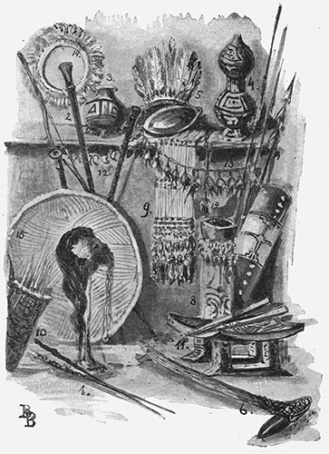 Etnografické předměty darované cestovateli do sbírek Náprstkova Průmyslového muzea (dnes Náprstkovo muzeum asijských, afrických a amerických kultur). Předměty darované českými „lovci orchidejí“ – č. 9 závěs na záda etnika Jívaro z ekvádorské Amazonie dovezený B. Roezlem, č. 3 hliněná nádoba darovaná Antonem Hübschem (1856–1893). Orig. B. Bauše, Vesmír, 1. ledna 1898