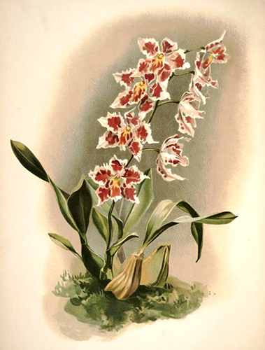 Dimorphorchis lowii (tehdy Vanda lowii). Orchidej zakoupená Theodorem baronem Hrubým z Jelení kolem r. 1873 v Hamburku za 75 franků. Po rozkvetení v červnu 1883 se stala evropskou senzací. Frederick Sander ji chtěl získat do svého anglického zahradnictví a baronu Hrubému bezvýsledně nabídl částku 5 000 franků. Obrázek, vzniklý nejspíše na základě vyobrazení Katy (Kateřiny) Maškové-Buškové, otiskla v r. 1884 všechna významná evropská botanicko- -zahradnická periodika. Deutsche Gärtner-Zeitung, 20. března 1884