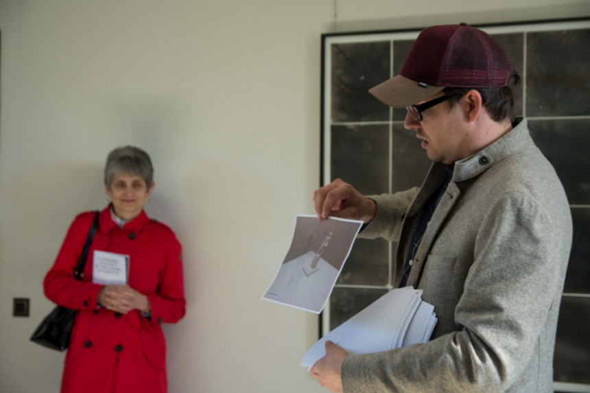 Český výtvarný umělec Rudolf Samohejl na zahájení výstavy Pátrání po zahradě zájmů, 9. října 2022 v Botanické zahradě v Meise (Belgie). R. Samohejl stojí před jedním ze svých fotogramů, vzniklých v kolumbijské oblasti Antioquia, inspirovaných cestami B. Roezla. Foto Česká centra – M. Juříčková, 2022