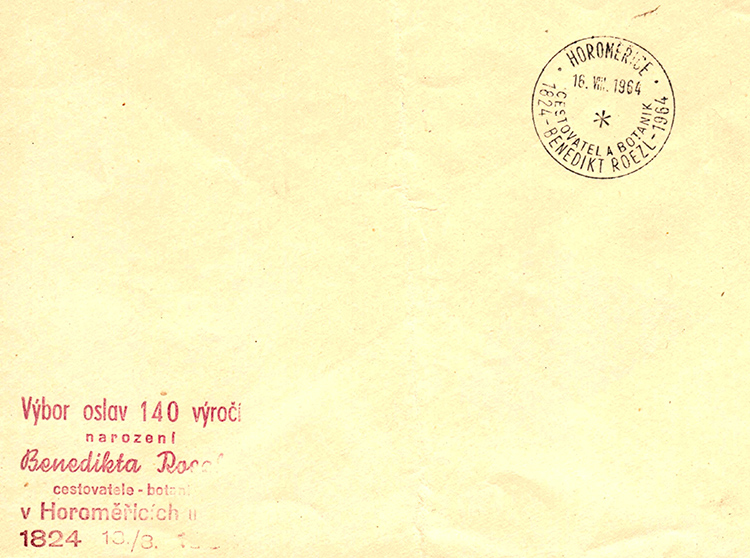 Obálka s příležitostným razítkem vydaným Československou poštou 16. srpna 1964 a razítkem Výboru oslav 140. výročí narození B. Roezla. Z archivu J. Tlustého