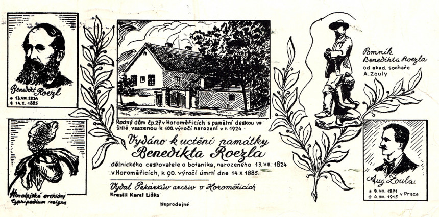 Jedna z pohlednic vydaných v Horoměřicích iniciativou Karla Pekárka a jím zřízeného Pekárkova archivu v Horoměřicích. Profesor grafické školy v Praze Karel Liška jí vytvořil v roce 1975 jako připomínku 90 let úmrtí B. Roezla.